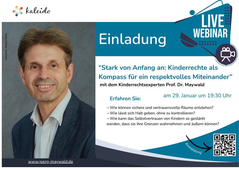 Diesen Fragen widmet sich das Webinar mit dem renommierten Kinderrechtsexperten Prof. Dr. Maywald, der sich an Erziehungsberechtigte und andere Bezugspersonen richtet, die Kinder achtsam begleiten und stärken möchten. Der Vortrag vermittelt alltagsnahe Impulse, zeigt auf, wie Kinderrechte im Familienleben gelebt werden können, und lädt zur Reflexion der eigenen Haltung ein.